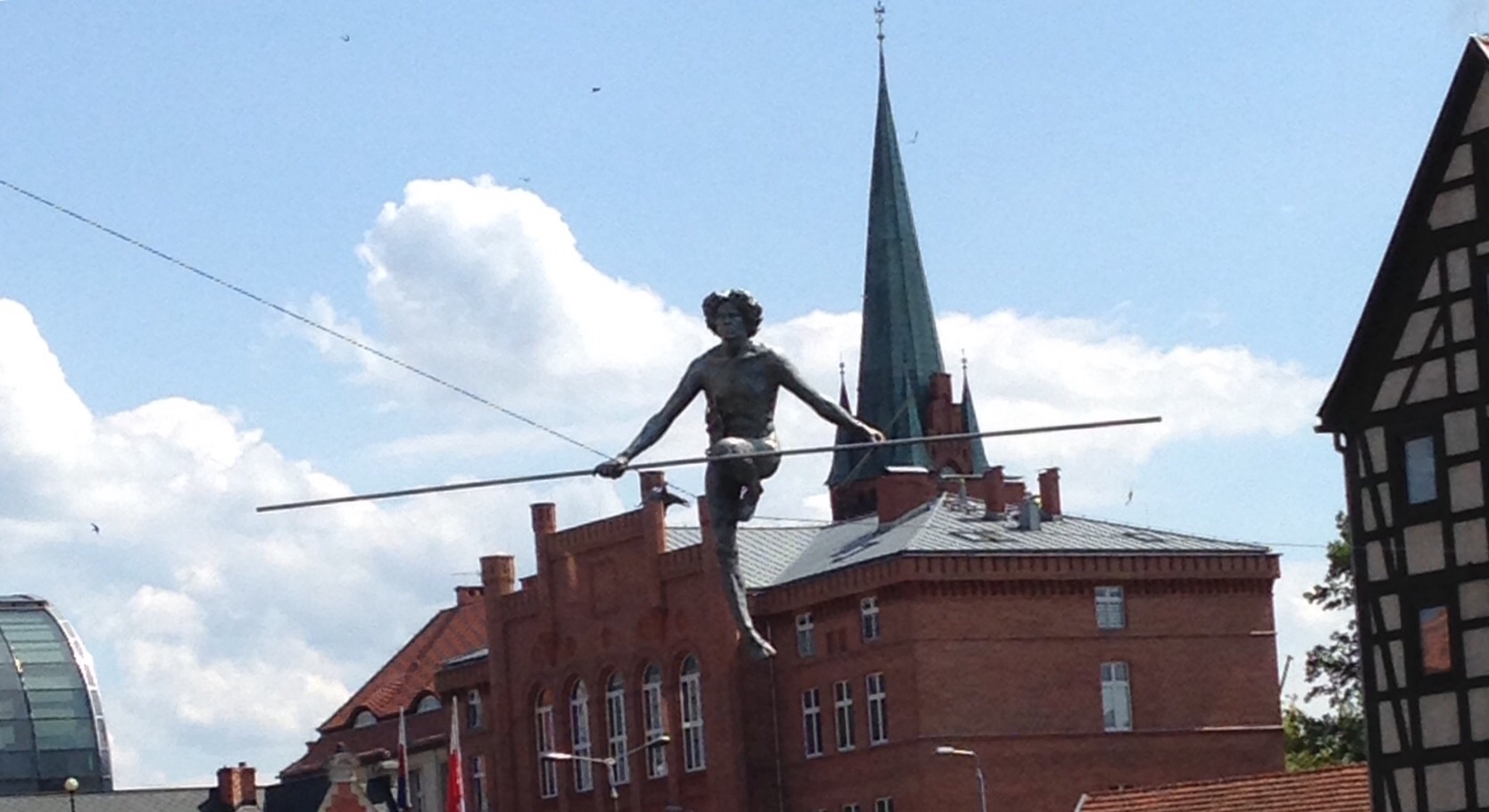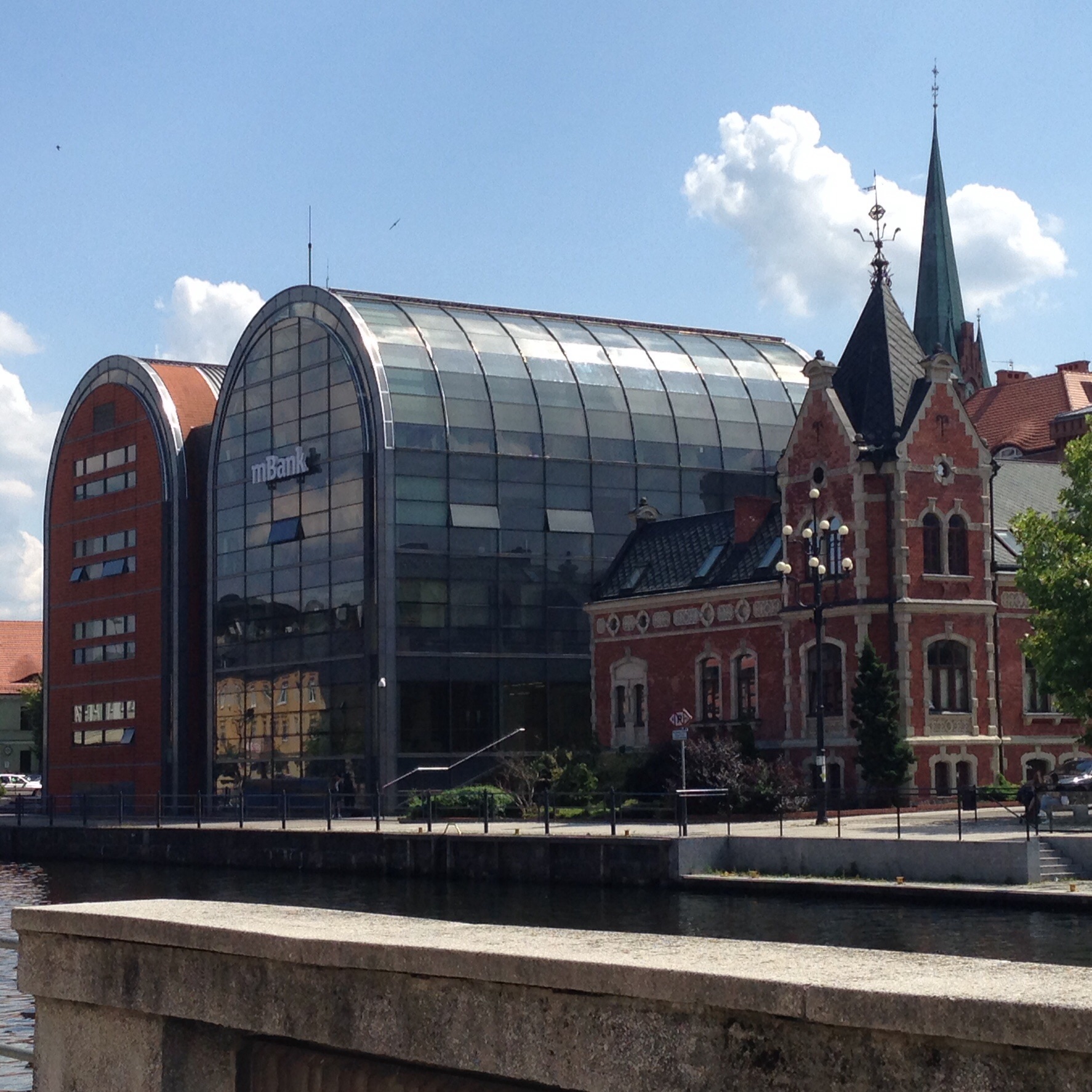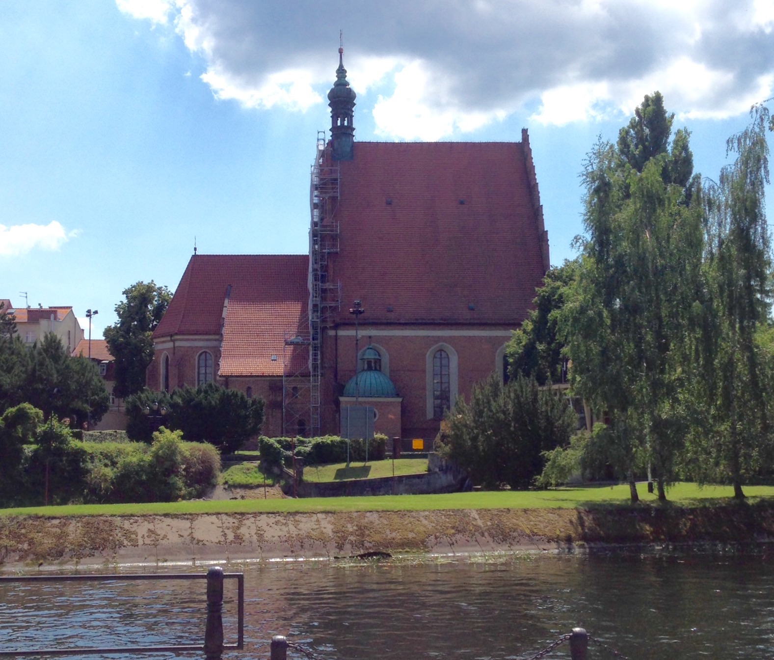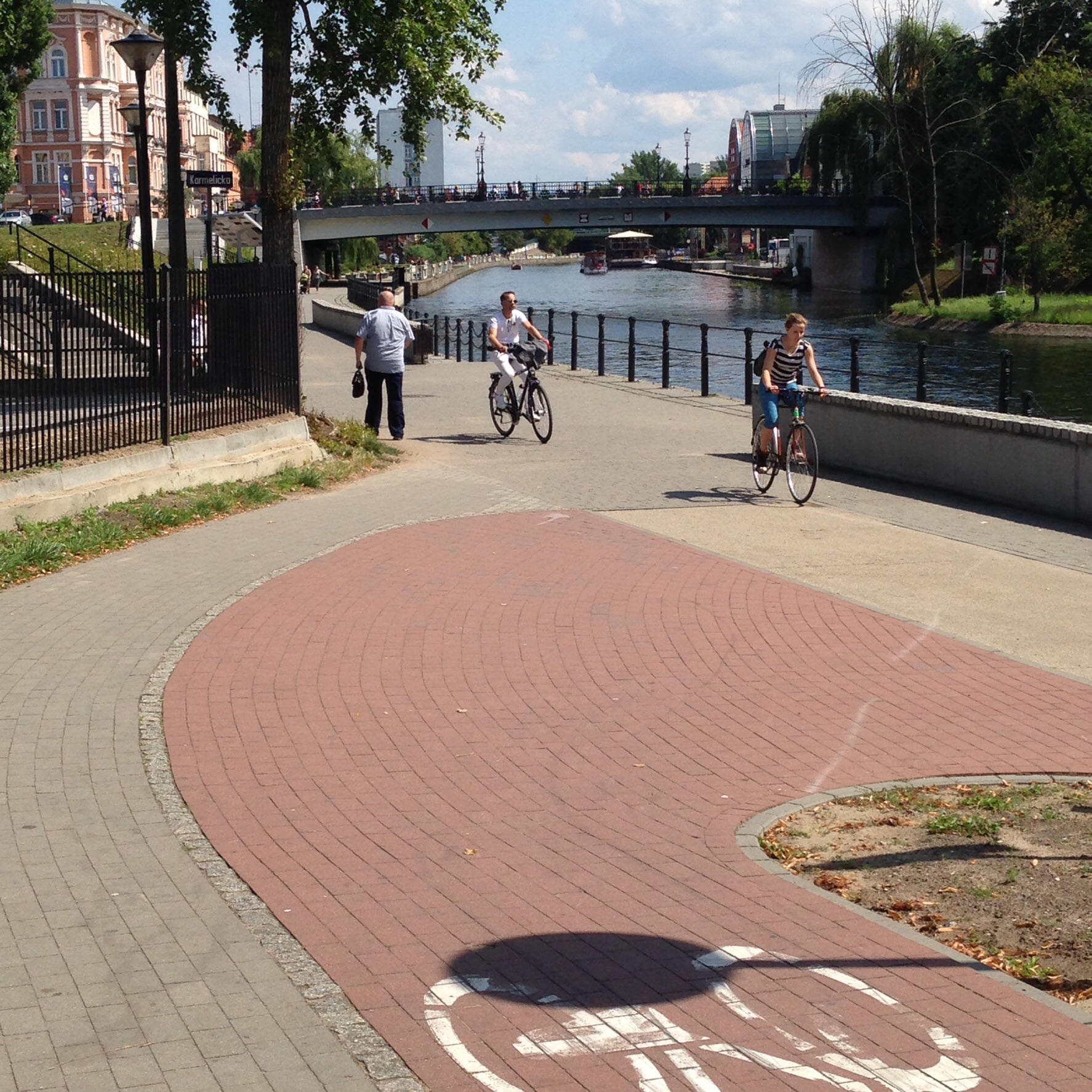 That’s because biking is big here and almost everywhere there is a sidewalk along the river or canal and sometimes the street, there is a bike lane (the red in this picture) and a pedestrian lane. If you take a quick look to your left and across the river, you’ll see the back side of the Bydgoszcz Cathedral
