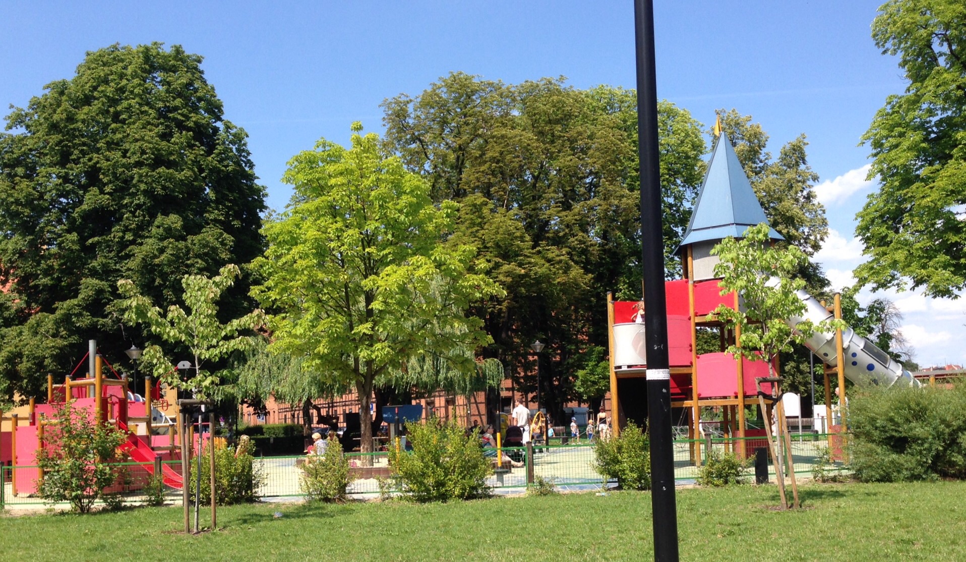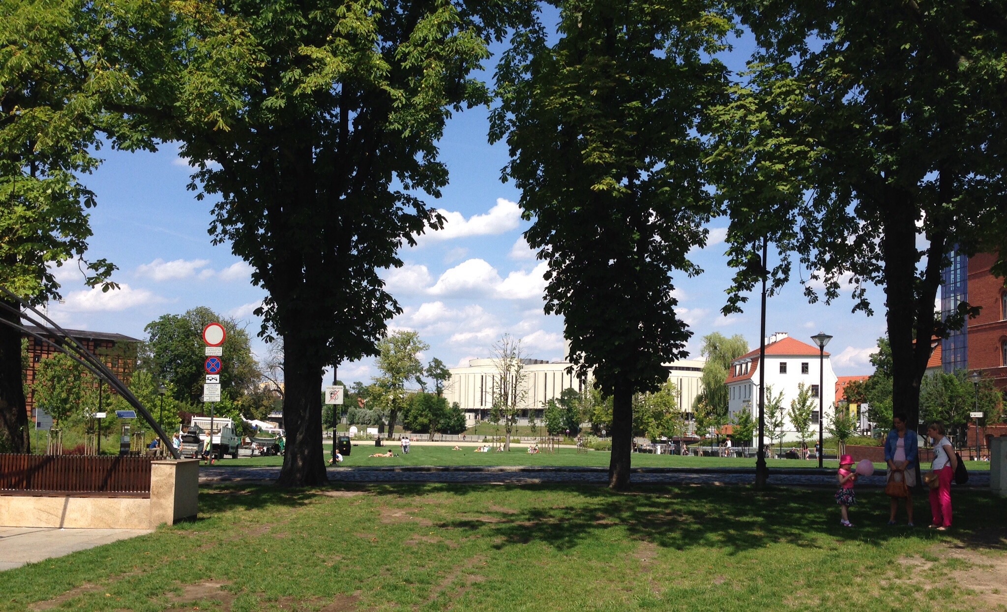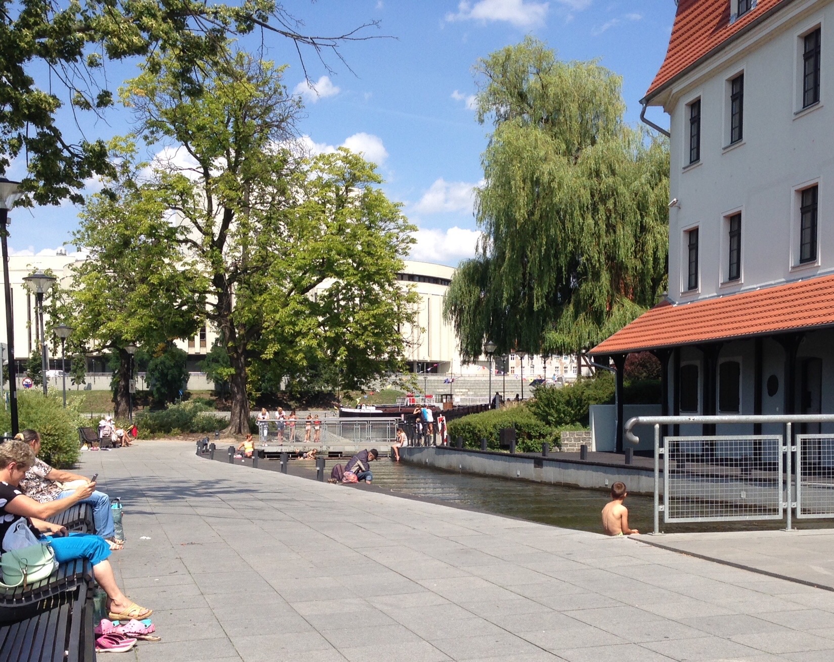 Now we’re going to say good-bye to Mill Island and cross yet another bridge to take us back over to the other side of the Brda river. But if you want to play in the water take off your shoes and wade around a bit Or you can sit on the bench and watch the kids wade around in a “sluicer” that runs behind the museum.