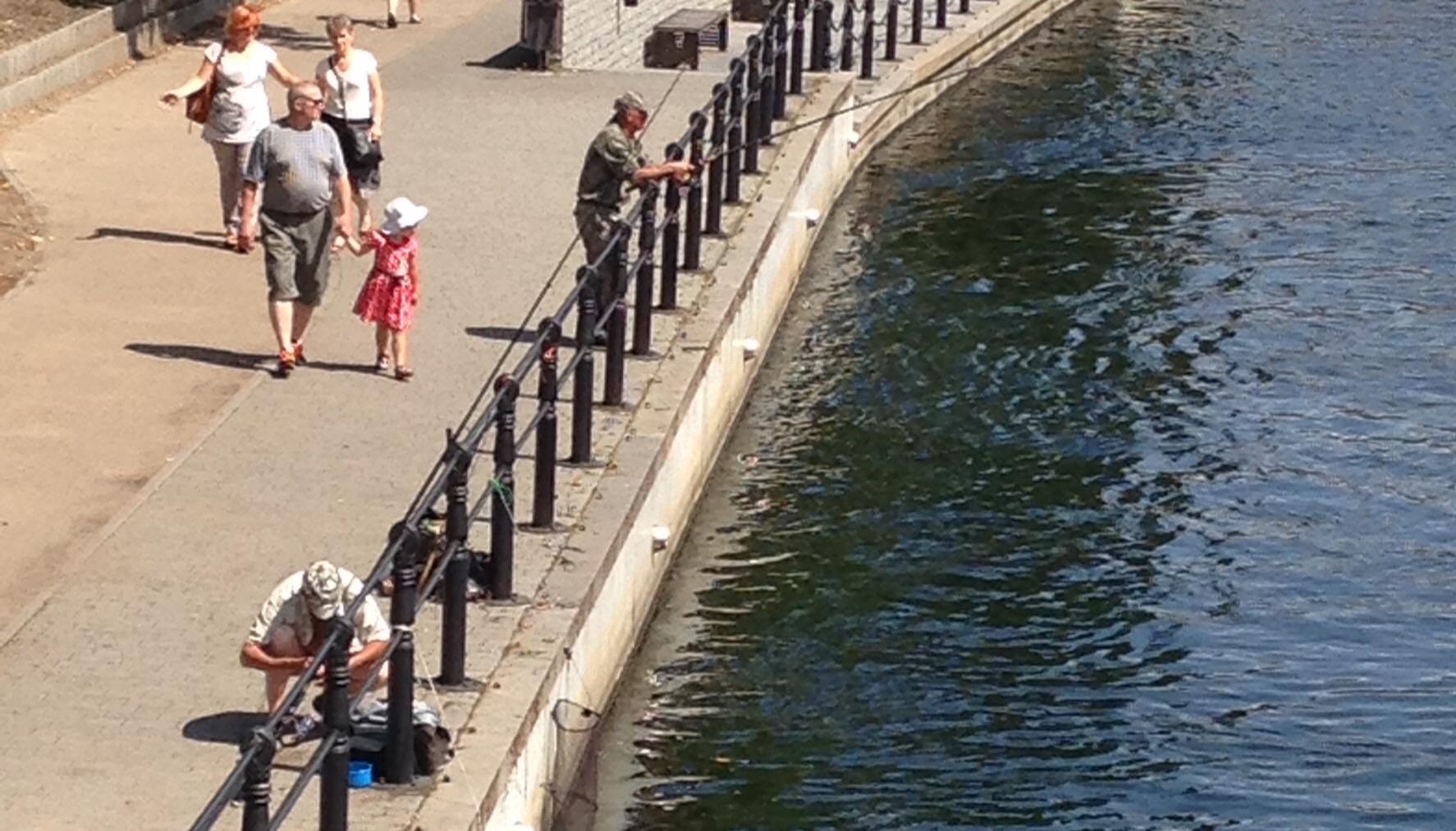 This is the view from the bridge looking upriver…which is where we are going. That’s the bridge we took to take us over to Old Town….so we’re almost back to where we started. For all you people who like to fish, you can bring your rod and reel and try it out. You might have missed it when you were looking at the scenery, but the man dressed in green caught 2 fish!