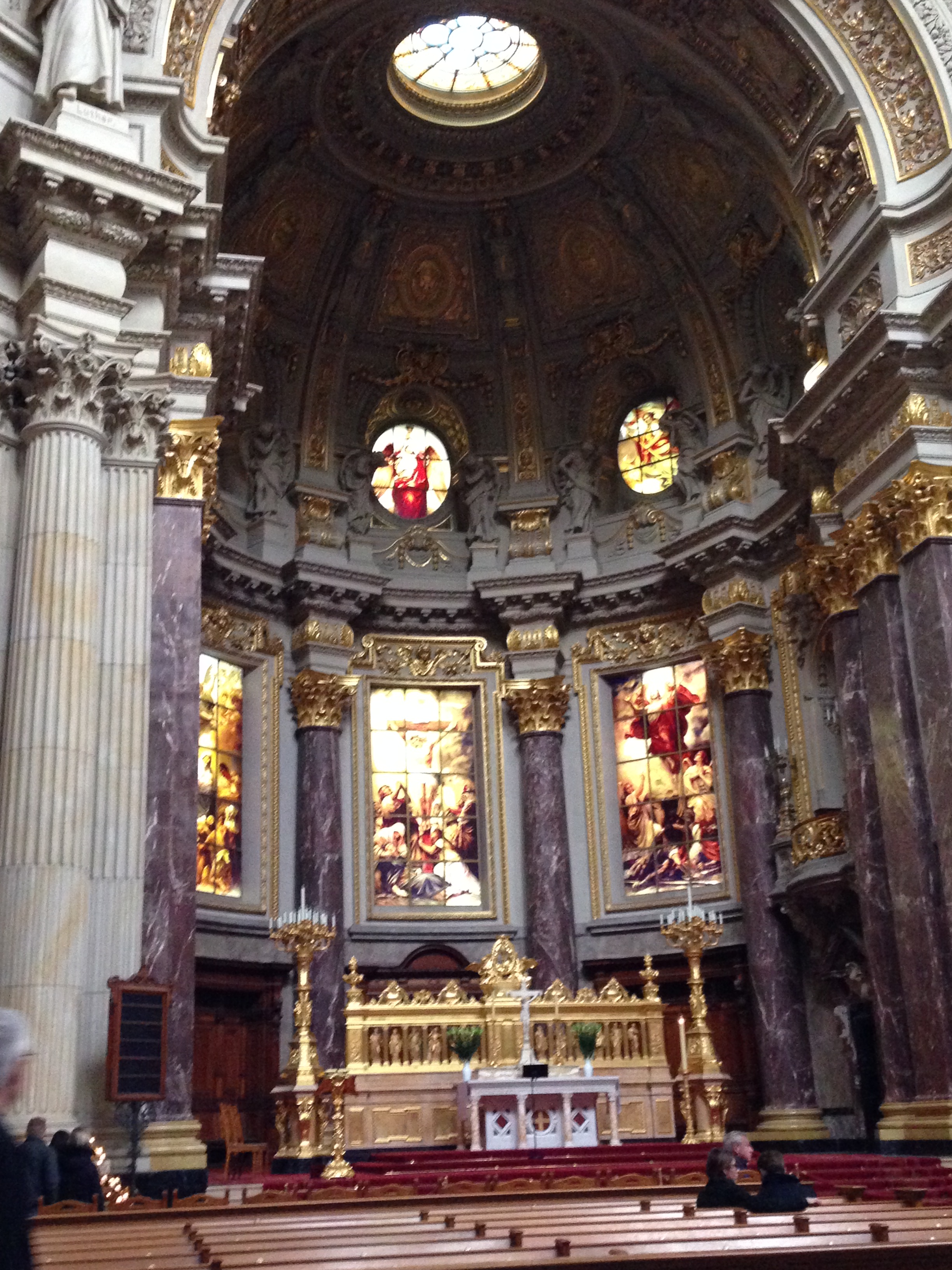Part of my bucket list while we are in Poland (and other parts of Europe) is to see as many churches and cathedrals as I can. They are so beautiful – and each one is different and they are a real testament to the faith of the people who lived here centuries ago. When we saw this building on our wandering jaunt to get to the Berlin Tower it seemed like the perfect place to visit. (Ok, really, we just wanted to see if we could get up to the walkway as the views would be amazing.) We didn’t realize it was a Cathedral until we got around to the front and read the sign. Completed in 1905, it’s the largest Protestant Church in Berlin and was patterned after St. Peter’s Basilica in Rome. Although technically, it’s not a Cathedral as it’s not the seat for the Bishop (which is what designates a church as a cathedral). As with most other buildings in Berlin, it too was heavily damaged during World War II, and was closed and not reopened until restoration work was completed in 1993.