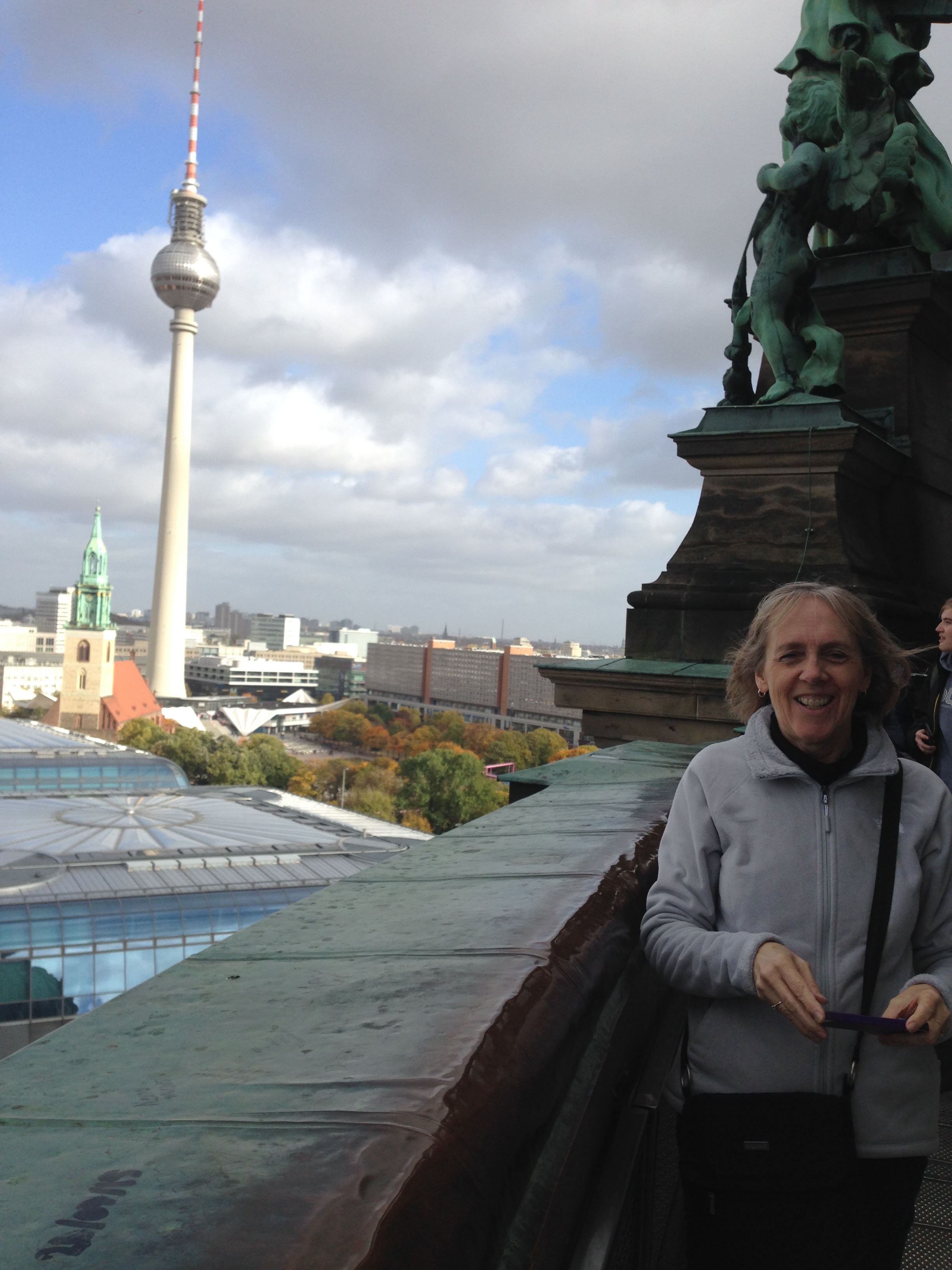 Finishing the climb, and stepping out onto the narrow walkway, you are greeted by these fantastic views of Berlin. This is my sister Jan with the Berlin Tower in the background.