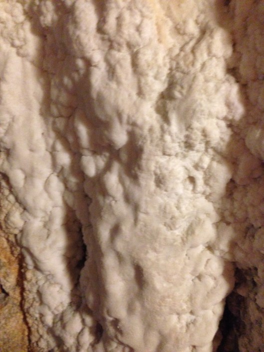 and more crystalized in other places where it looks more like cauliflower growing out of the wall.