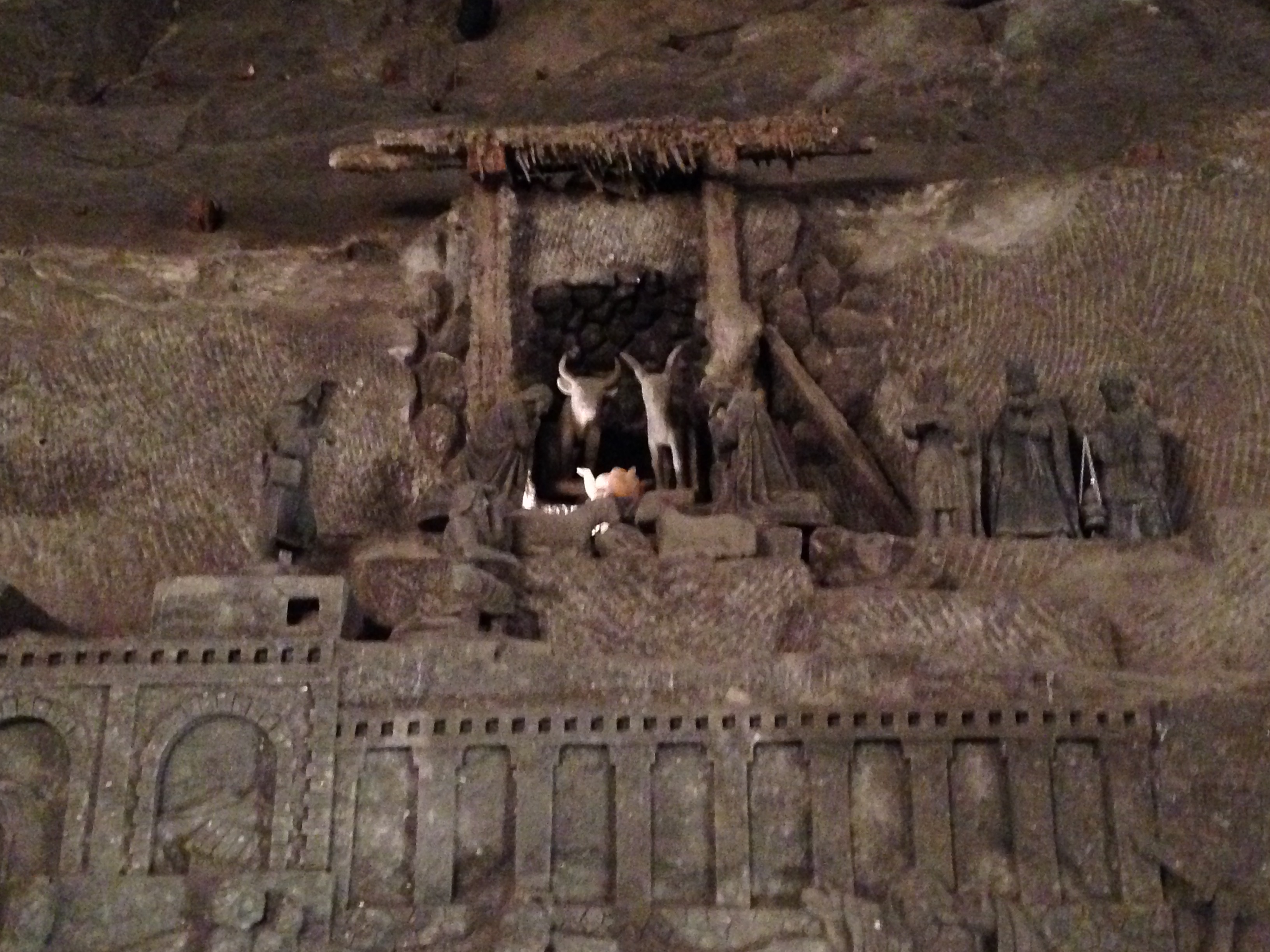The walls are covered with carvings that were done by the mine workers themselves, not famous artists or sculptors…but the mine workers. Like this one of the manger scene…see the cows looking after the baby and the Three Wise Men?