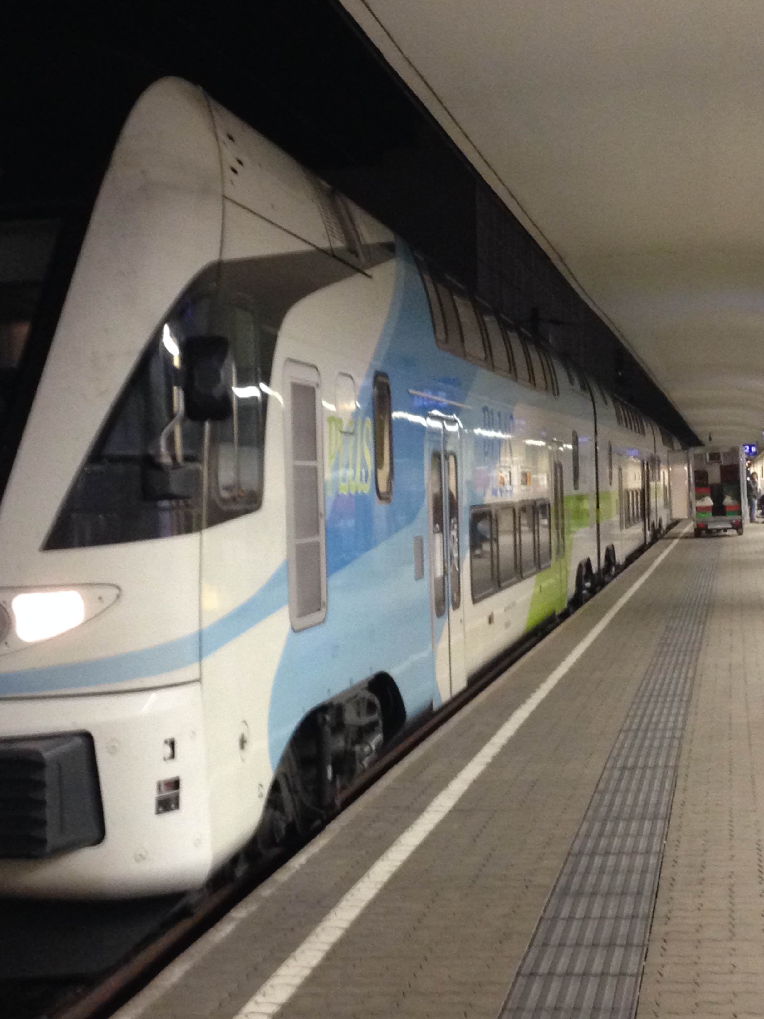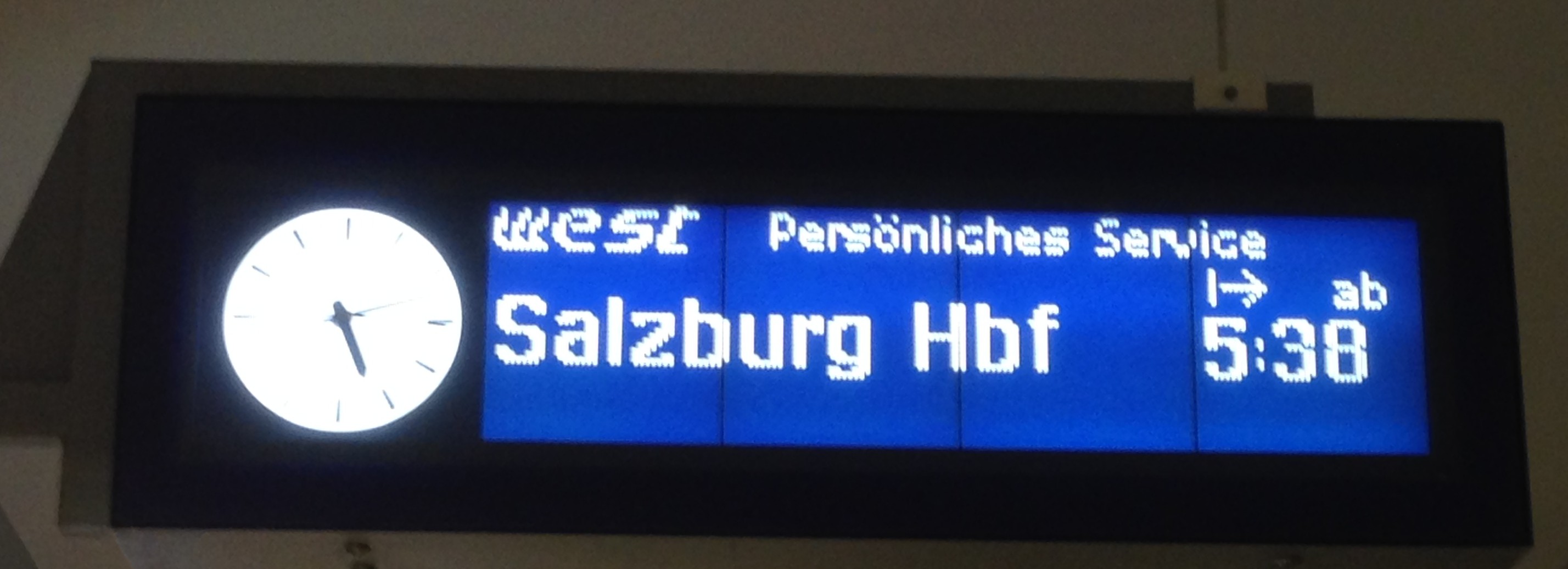 The next morning, we were up bright and early to catch the train to Salzburg.  That’s 5:38 AM departure time!  IMG_6949Train travel is so easy in Europe and it’s a great way to see the ountryside while relaxing in comfort…unless it’s dark like it is at 5:38 in the morning.IMG_6950Wouldn’t it be great if America could figure out mass transit like the Europeans?). A short walk from the Salzburg train station to the Town Square and we were ready to hop on our bus!IMG_6989