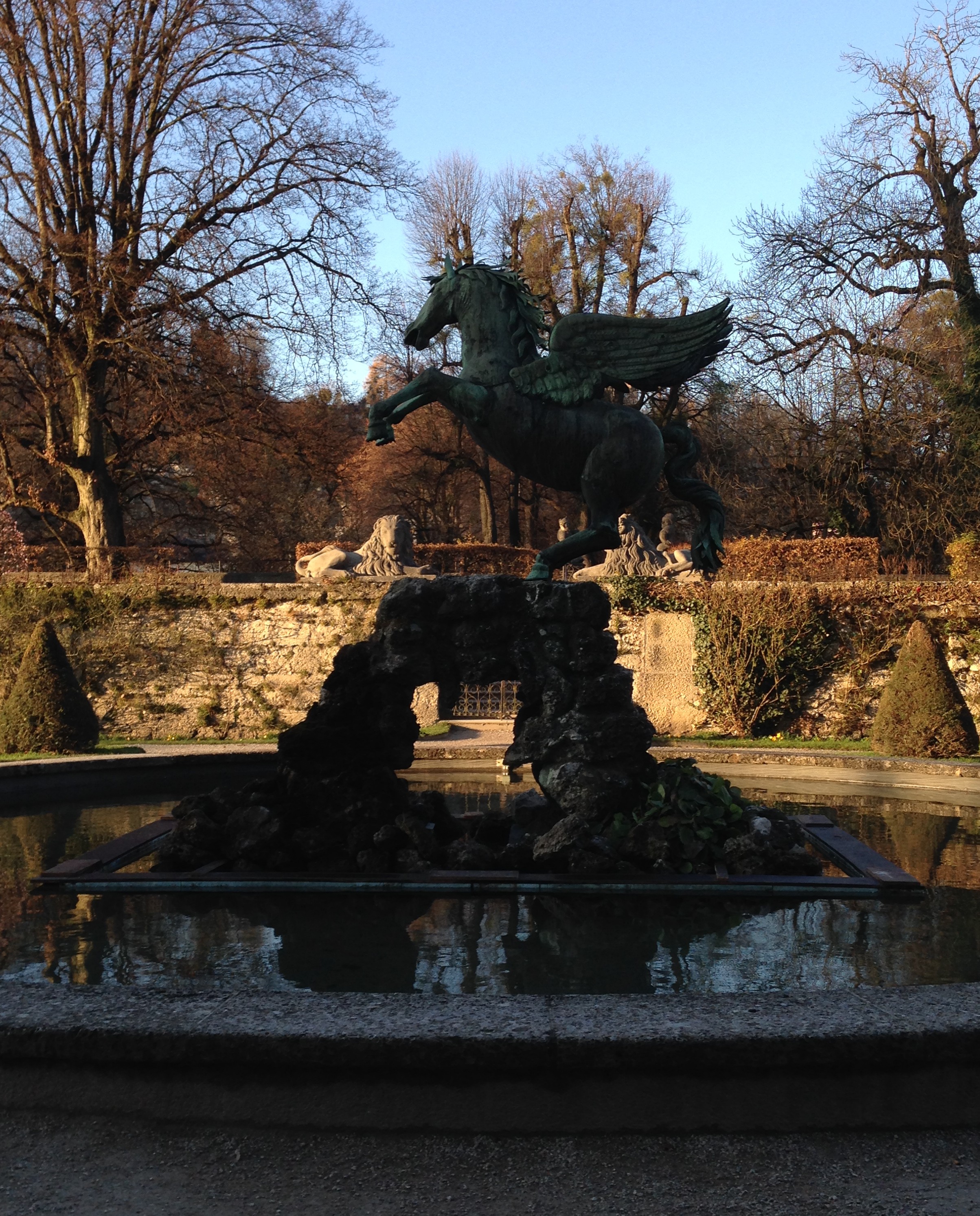 Mirabell Gardens is part of Mirabell Palace.  At one end of the garden are these steps where the children hopped up and down while singing Do, Re Mi.IMG_6980And then they danced around this fountain with the Pegasus statue,IMG_6985 and this fountain, which is not operating now in the winterIMG_7144 and then they ran down this tree lined pathIMG_7136…and out into the town.