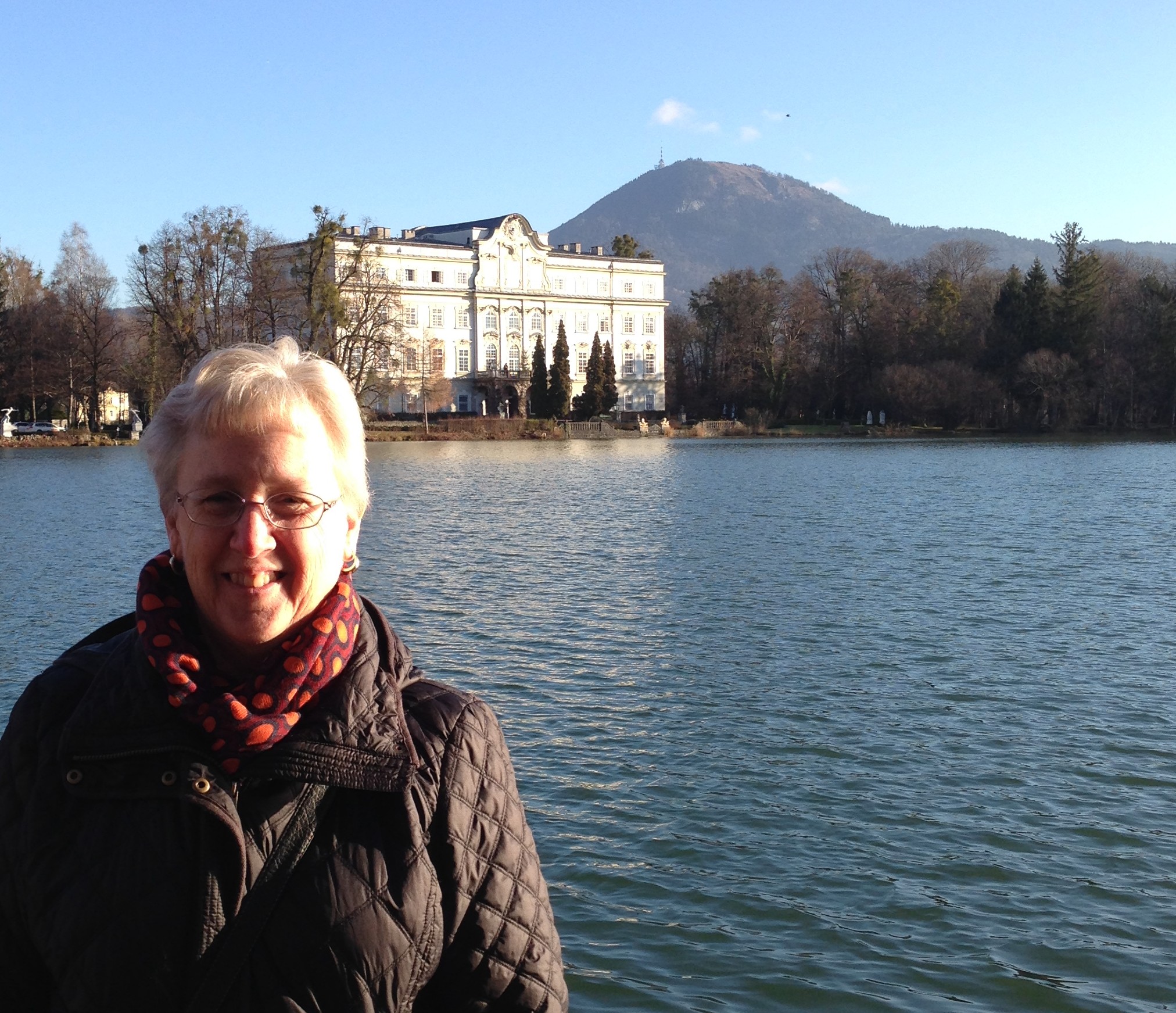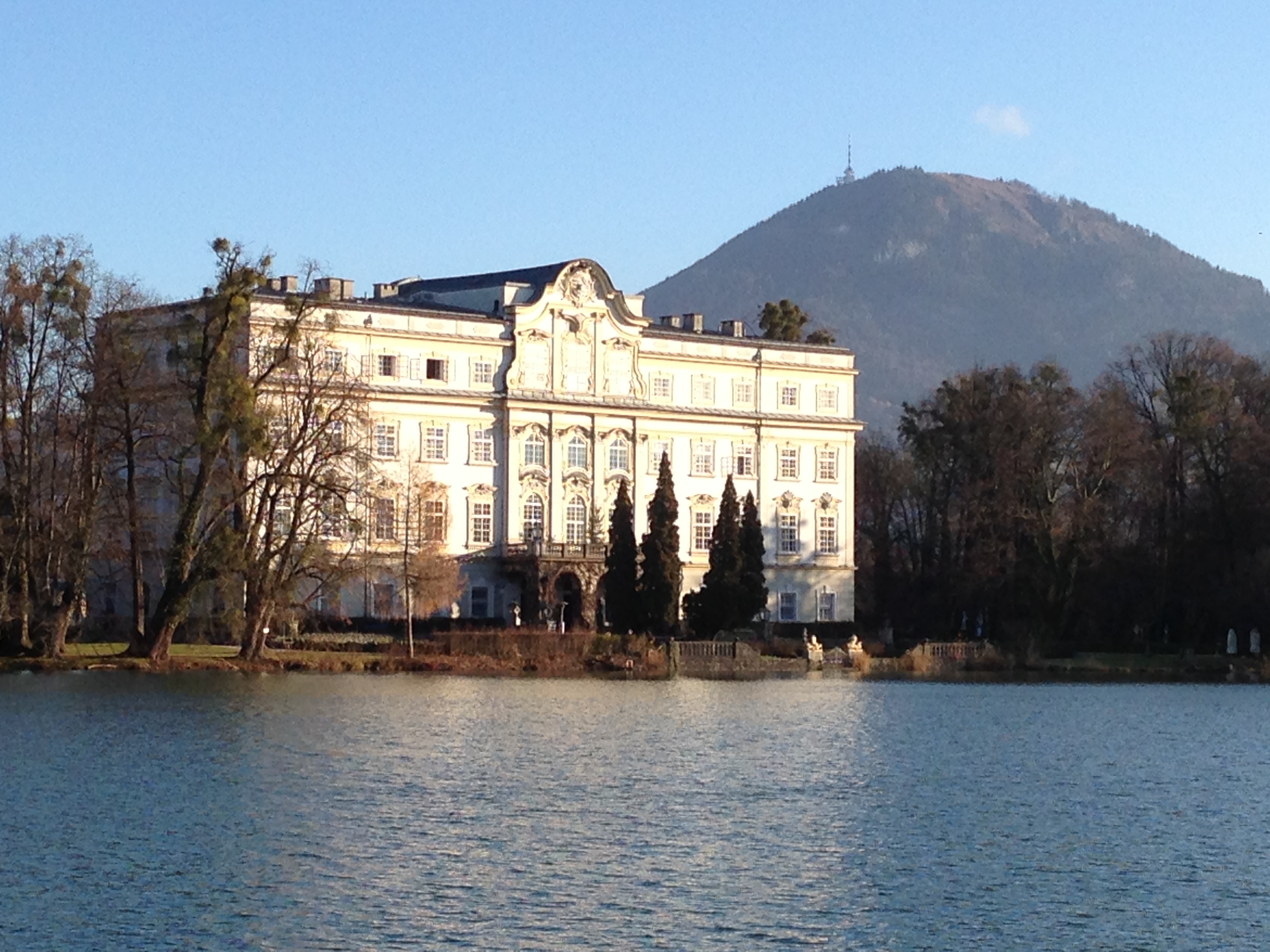 The first stop was to visit one of two houses that was used for the exterior shots of the von Trapp house.  Yes two…one house for the front and a second house for the back.  They are both privately owned, so you get a view from afar…in this case from across the lake.   This house  behind me is Leopoldskron Castle which was used for the outside scenes for the back of the house.  It is now owned by Salzburg Seminar, an organization founded by Harvard Graduates. IMG_7005 Its hard to see, but you might recognize the gate where Maria and the children were in a boat and then capsized into the water and got out dripping wet to meet their father.  This water is actually a small lake….I’m not sure why, but I always thought it was a river that ran behind the house.IMG_7003 Another interesting fact: The scene when Maria and the Captain are talking about the children, did you notice that they are never shown talking together?  The Captain’s back is to the water…that was shot at this house.  Maria replying to him is shot with her back to the house….but not here…those scenes were shot at this house, Frohnburg Castle, that is several miles away.IMG_7039The same house that is shown when Maria makes her first journey to the house to become the “governess”.  See those trees?  That’s where the children were hanging in the trees wearing play clothes made out of curtains.  It is also not open to public, which is why you might see reflections in the pictures.  They were taken while we were on the bus.IMG_7012Let’s go back to the first house.  Did you notice anything missing from the backyard? Where is the gazebo?  after the movie filming was over, the gazebo was given as a gift to the city and later moved to a the park at Hellbrunn Castle.IMG_7016Several in our tour group pretended to leap for the cameras, that wasn’t happening with me, so I just pretended.IMG_7020Did you know there were two gazebos used in the movie?  The real one…this one…is all glass.  Another gazebo was built in a Hollywood studio with open “doorways”. Seemed “Liesl” sprained her ankle jumping around the benches and they had to reshoot the scene, so they made it a bit bigger.