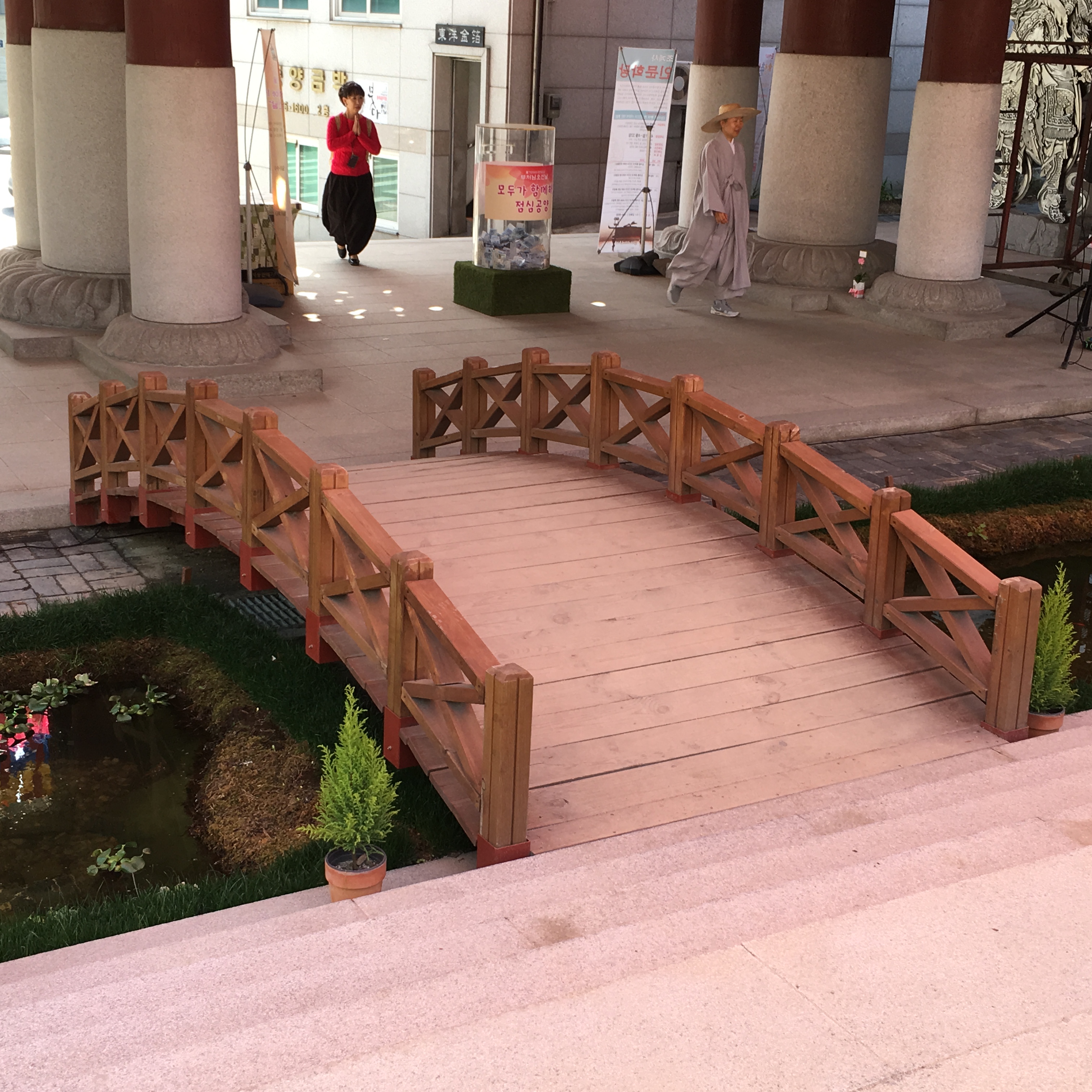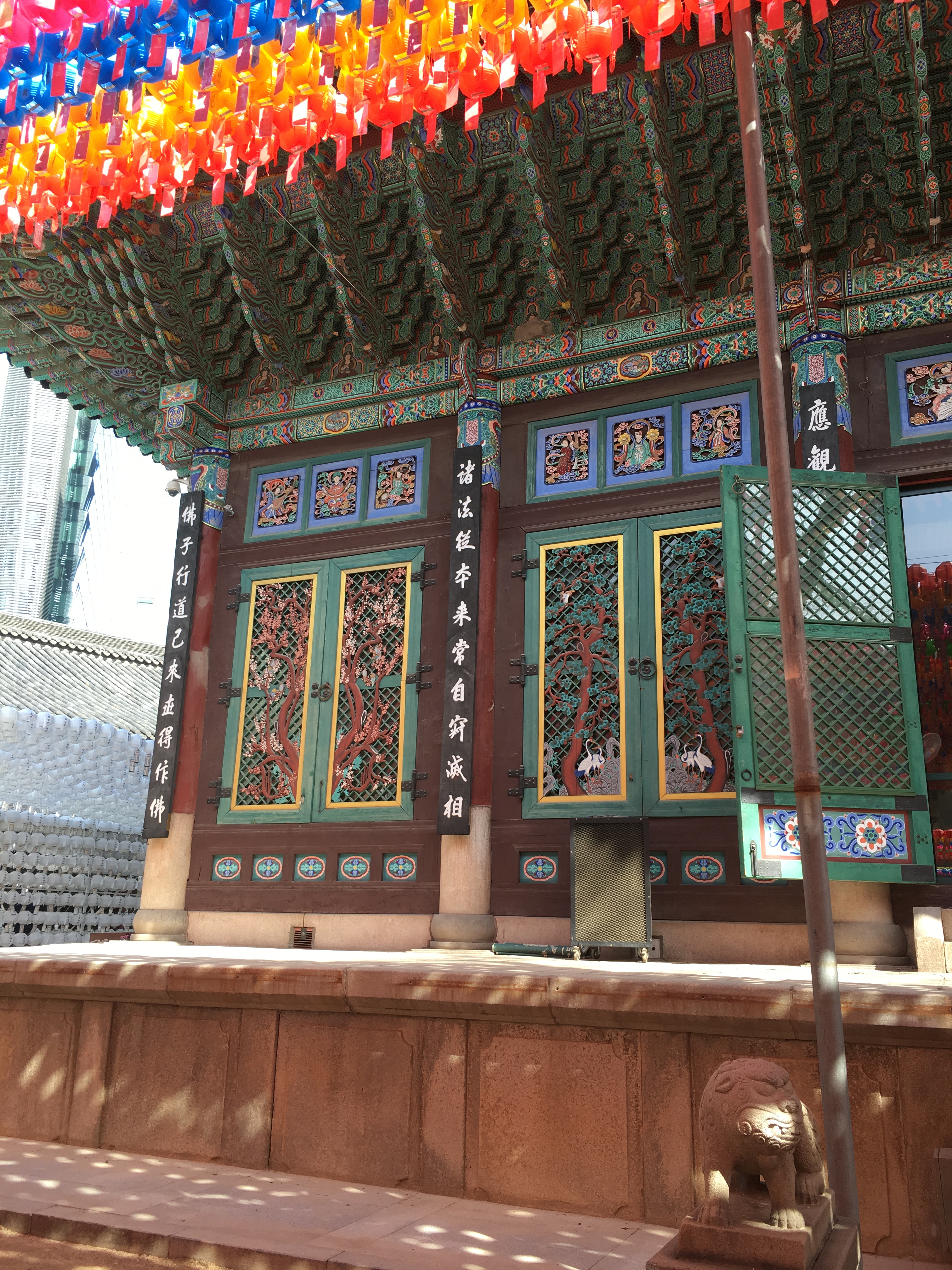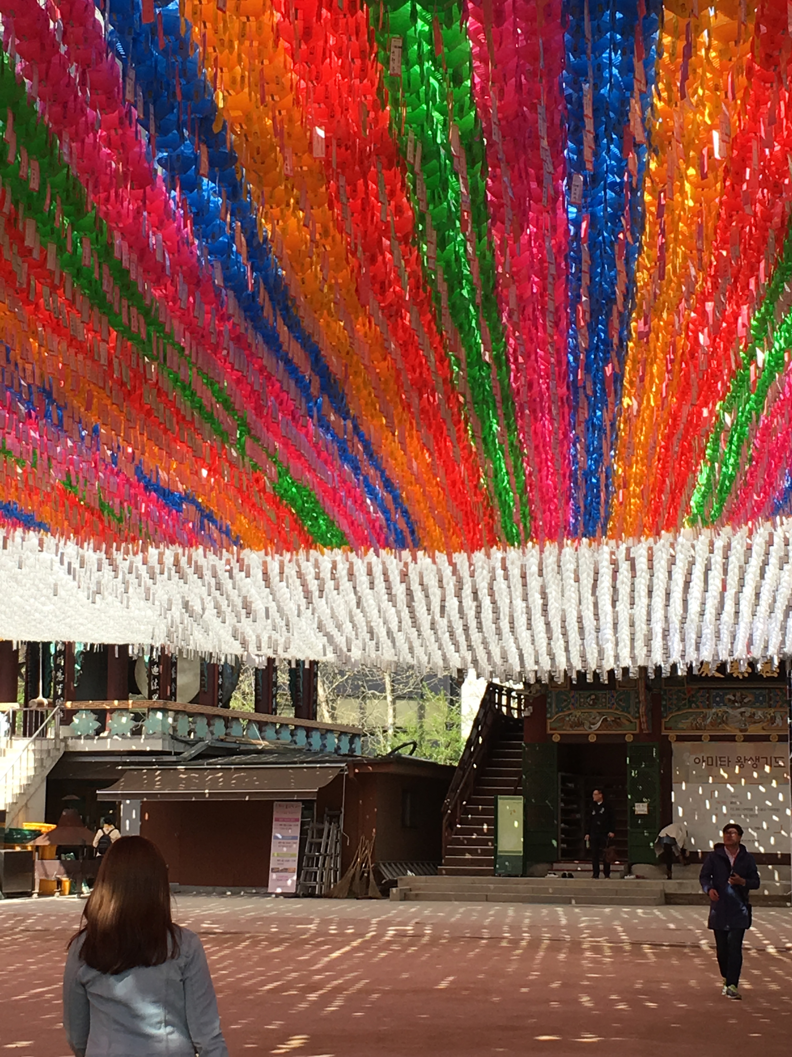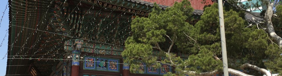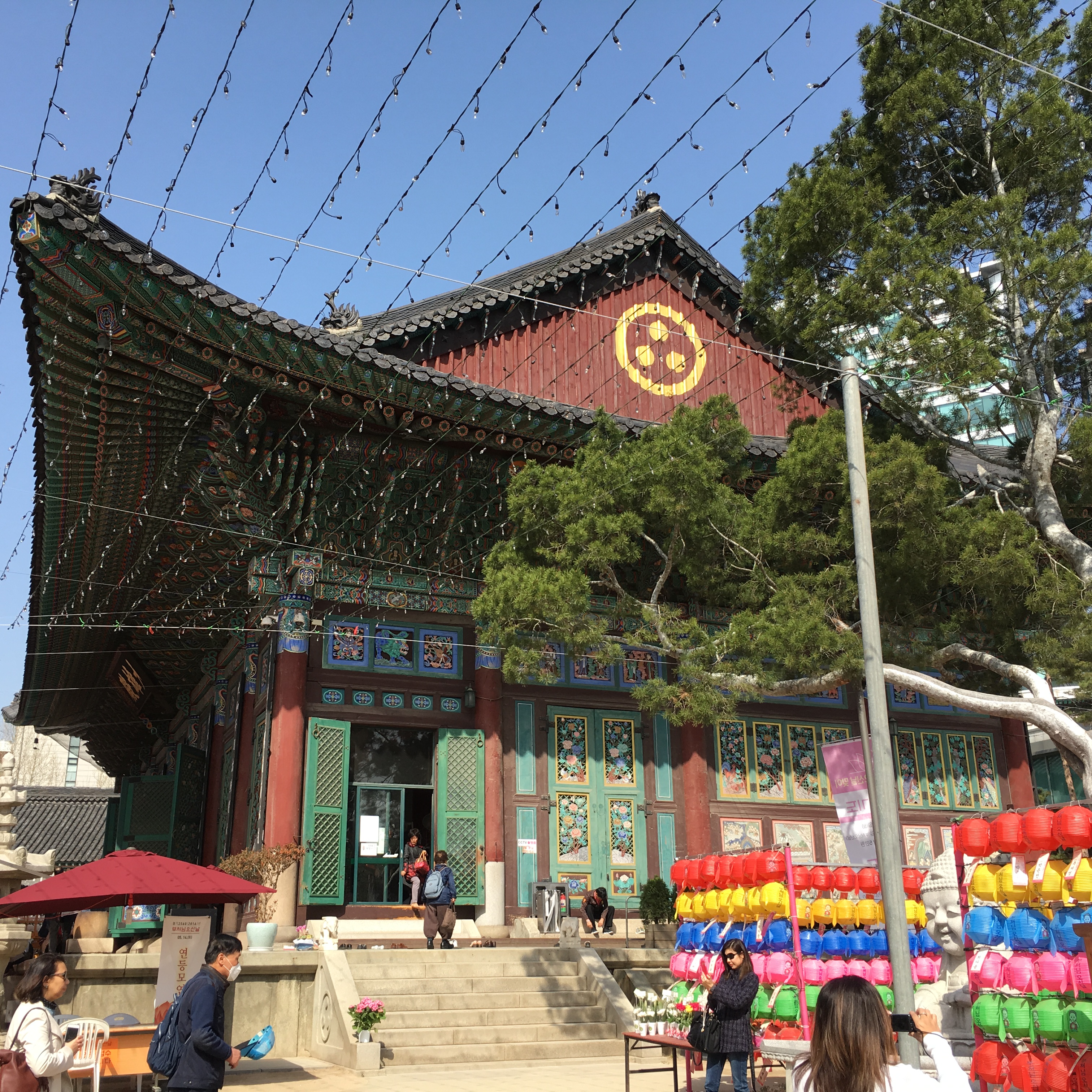 They hold a sword, a dragon, a wish-fulfilling jewel, a trident, a stupa (a sphere containing relics), and a lute in their hand, all to protect those entering from evil. Each one watches over one cardinal direction. Every temple also has a bridge that crosses over a stream.  The bridge represents crossing from suffering over to the joy of enlightenment. IMG_0835One of the first things I noticed were these colourful lotus lanterns with tags attached.  Each lantern (and tag) represents a wish.  The white lanterns are wishes for people who have died and the colored lanterns are wishes for those still living.IMG_0808 - CopyWhile I was there in mid April workers were busy putting up more wire to hold more lanterns. They were getting ready for the lantern festival that is held each May in the celebration of Buddha’s birthday.  Also outside the temple, there are several large trees -locust and baeksong trees – which are about 500 years old.  The Baeksong tree (below) is actually designated as a National Monument.IMG_0805The main hall of the Jogyesa Temple and the grandest building here is called Daeungjeon (translated means “Hall of the Great Hero)