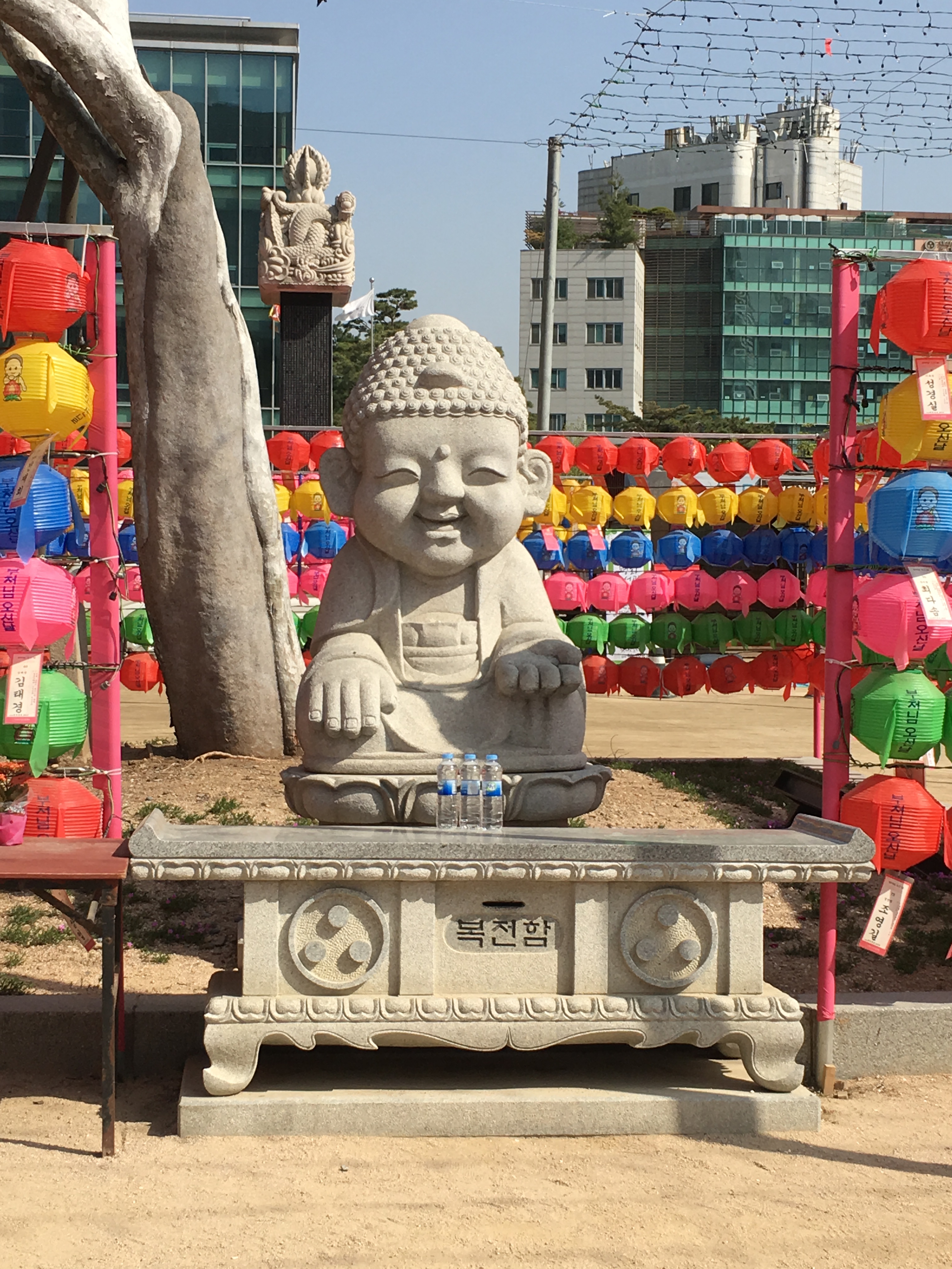 temple-jogyesa-00050[1]There are stairs and doors decorated with beautiful flower designs on every side. IMG_0815 - CopyInside the building are several statues including the statue of Seokgamoni. He is the central figure to all forms of Buddhism and within most temples, he is the main statue occupying the Main Buddha Hall.  IMG_0813 - CopyThe doors were closed on the day I was there, and there is no picture taking inside (and you must also take off your shoes before entering) but if you look closely in the picture above you can see the three Buddha statues through the glass.   Outside the doorway is this little elephant guarding the door….or maybe the shoes that are left outside the temple entranceIMG_0823 - CopyOutside are several statues, including this one of the Baby Buddha (where someone has left a “water” offering on the altar). IMG_0822If you want to make a wish of your own, all you have to do is write down the details of your wish – be it for good health or happiness, or even as simple as good test scores for your children.  Then you put your slip and donation into the slot.  If you are a true believer, your wish will come true.IMG_0806 - Copy