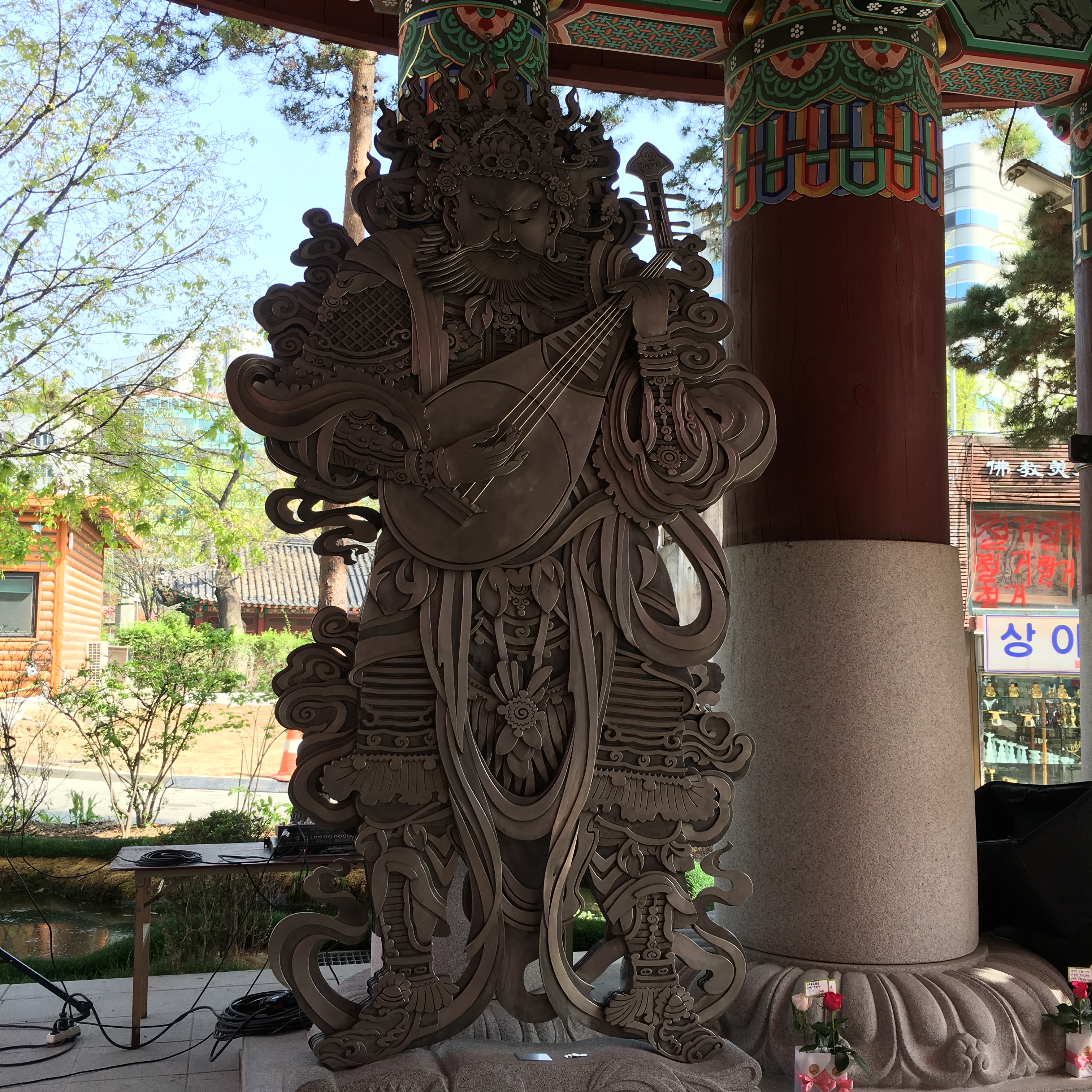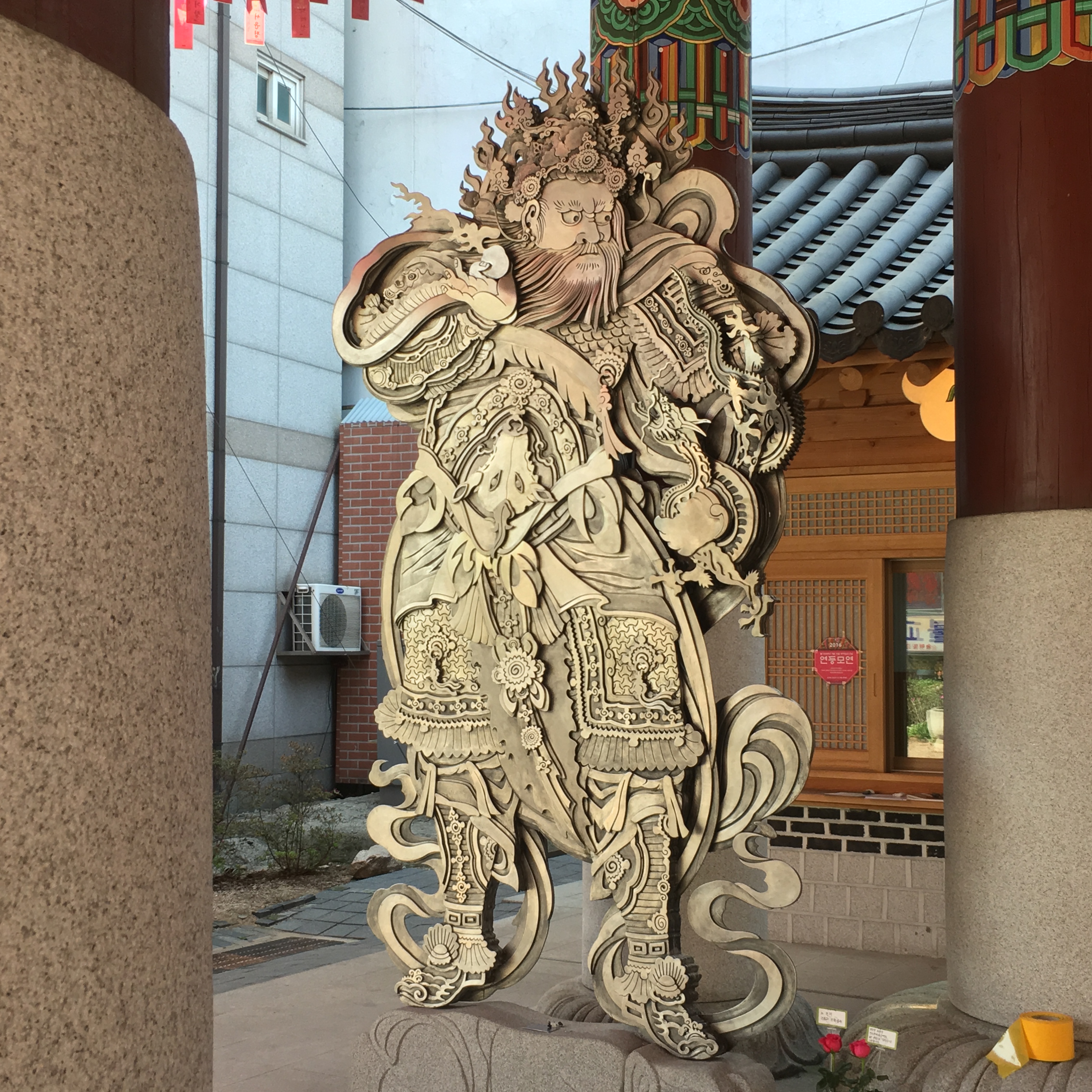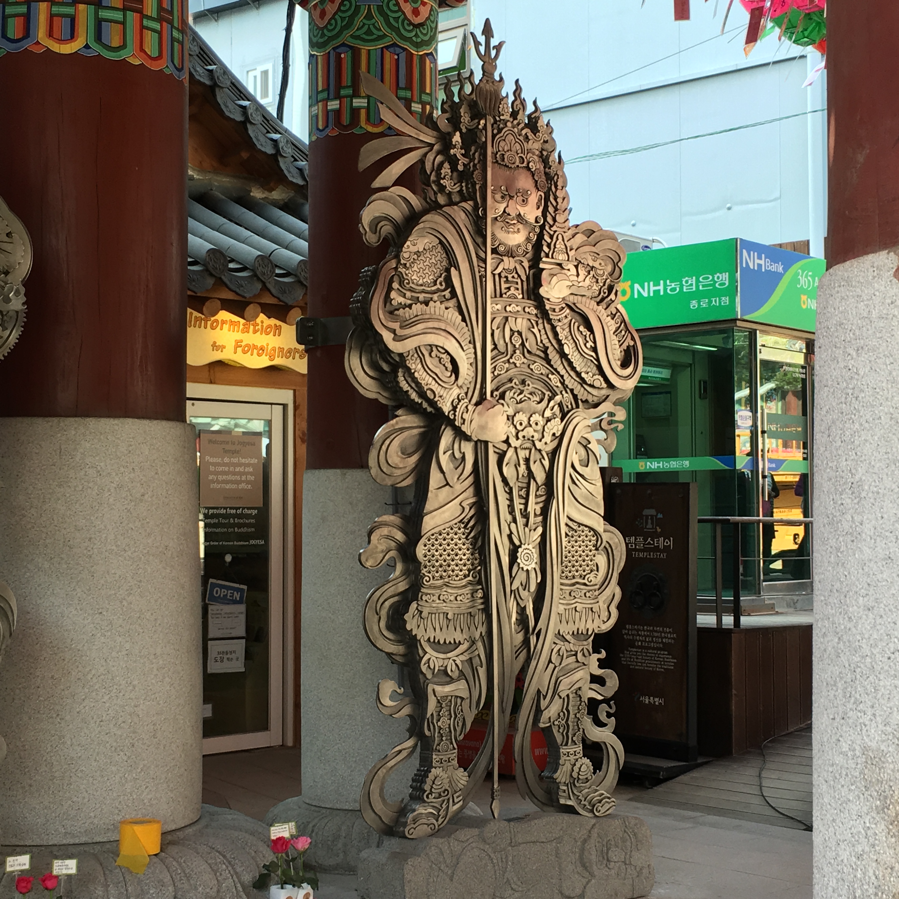 The first stop was to visit Jogyesa Buddhist Temple, one of Korea’s most famous Buddhist Temples.  It’s located smack dab in the middle of the hustle and bustle of the city.  The first Buddhist temple was built here in 1395 during the Joseon Dynasty.  The present temple was constructed in 1910.IMG_0834Before you get to this building, you have to go through the entry gate.  This gate represents the dividing point that separates the mortal world from the world of Buddha.  At the Jogyesa Temple, the gate is guarded by 4 iron statues that stand by each of the four pillars that support the gate.