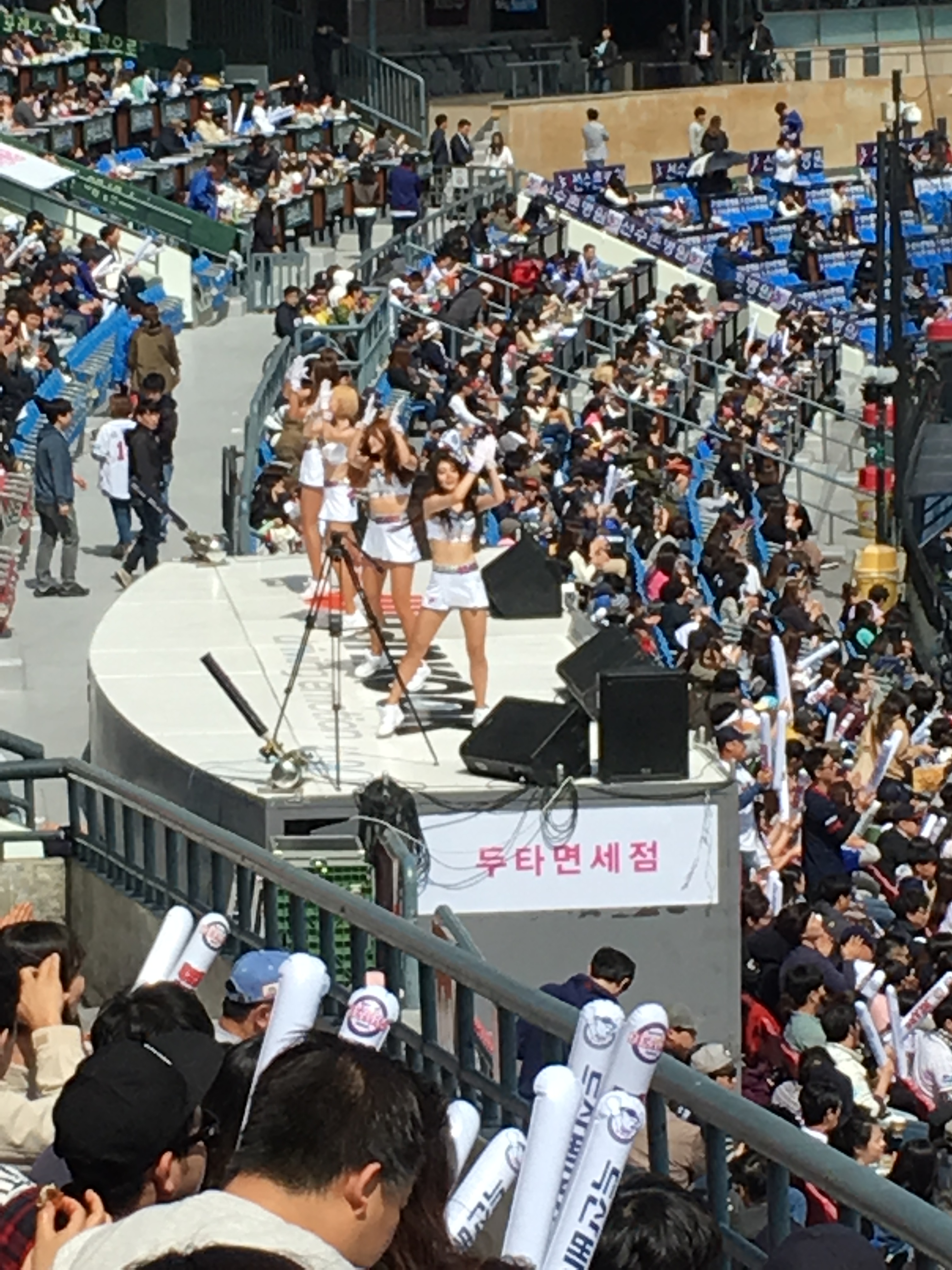 He is helped by the four young women cheerleaders who dance along and help lead the crowd in all the hand motions. Although I think they are just for show, the fans didn’t need much encouragement to cheer and sing along. When their team is at bat, the fans cheer THE ENTIRE TIME. Each player has his own “song” and when the players are at bat, the crowd sings and waves their “thunder sticks” in time to the music. It was interesting to hear the music to the Beach Boys’ “Surfing USA”, but sung in Korean (and not the actual words to the song, but words that include the player’s name.) The cheering/singing only stops when the other team it “at bat” and then the opposing team’s cheerleaders take over with their own set of songs and chants and the other side of the stadium starts rocking with noise.
