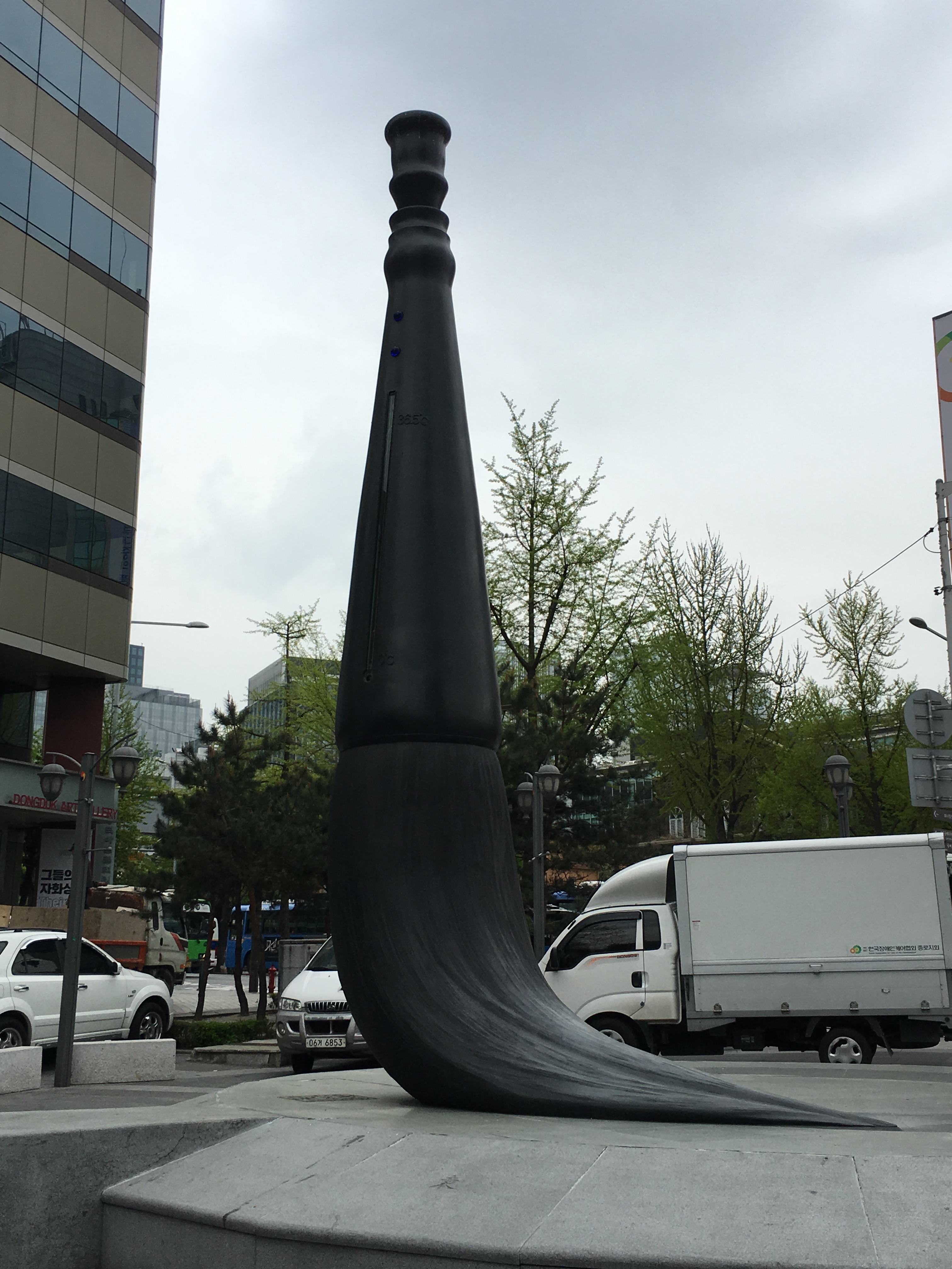 It’s meant to cut down on suicides & people jumping onto the tracks. I like the glass barriers because you know exactly where the subway cars are going to stop and where the doors will open, unlike if you are riding the metro in Washington DC where everyone wanders back and forth on the platform as the train approaches the platform trying to guess where and when it will stop so you can be near the door. There is a City Hall subway stop, but we came up several blocks before that stop so we could walk through the shops in Insadong. There is a sculpture of a calligraphy brush at the beginning of the street that leads to this area which is known for it’s art galleries, souvenir shops and restaurants.